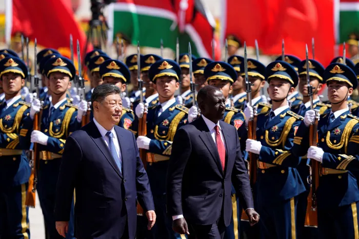 China's President Xi Jinping (left)) and Kenya's President William Ruto inspect the guard of honour during a ceremonial welcome at the Great Hall of the People in Beijing on April 24, 2025. The proposed zero-duty access is expected to unlock new opportunities for Kenyan exporters, says the writer.